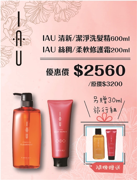 優惠加碼:贈送IAU洗髮精+修護霜旅行組*1 (隨機出)